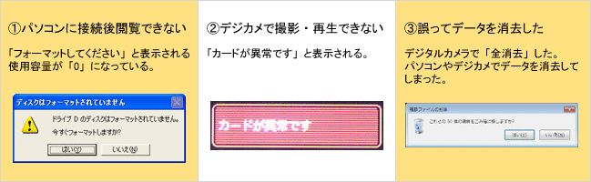SDカード/MiniSDカード/MicroSDカード/XDカード スマートメディア/コンパクトフラッシュ/ メモリスティックDuo パソコン等での認識が不可能であり、メモリの分解を要する障害 |